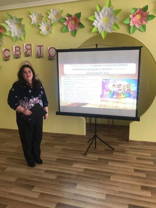 Музичний керівник Мамаєвська Галина Іванівна підготувала консультації «Музикотерапія в дитячому садку», «Розвиток музичного сприймання дошкільників, як засіб формування творчої особистості», майстер-клас для вихователів «Гра на діатонічних дзвониках», семінар-практикум «Музикограма», заняття для середнього дошкільнього віку «В гості до весни».