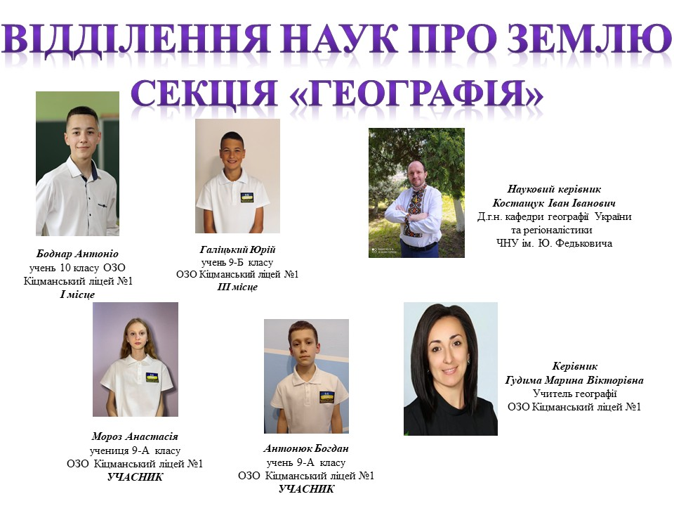 17 та 25 лютого відбувся ІІ етап Конкурсу-захисту учнівських науково-дослідницьких робіт Буковинської Малої академії наук учнівської молоді (обласний етап). Наші юні науковці-ліцеїсти гідно представили результати своїх наукових досліджень. Пишаємося здобутими результатами. Бажаємо й надалі розвивати науку нашої країни. Окрема подяка д.г.н., завідувачу кафедри географії України та регіоналістики ЧНУ ім. Ю.Федьковича Івану Костащуку та вчителям-наставникам Марині Гудимі та Галині Рихло.